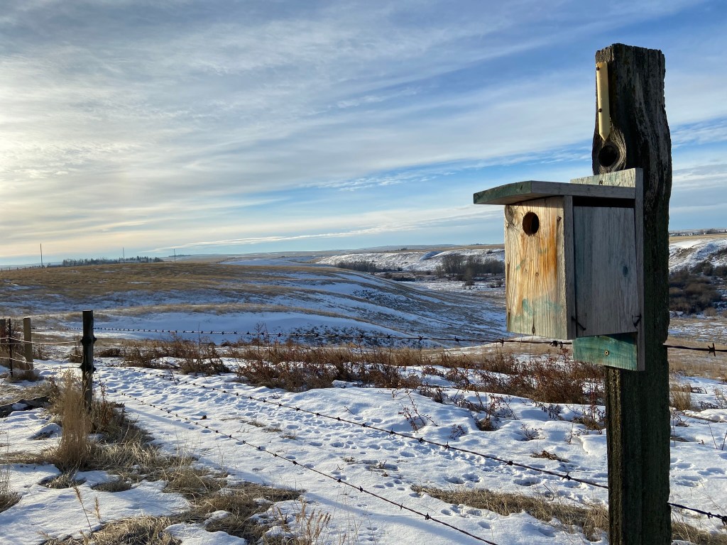 You can encourage bluebirds to come to your area by putting up nest boxes. Remember to point them east to face way from those strong west winds, and also to not overheat from the southern sunlight. Find out more about bluebird nest boxes here: https://www.battleriverwatershed.ca/wp-content/uploads/2021/05/AWES_Building-and-Installing-Bluebird-Houses.pdf